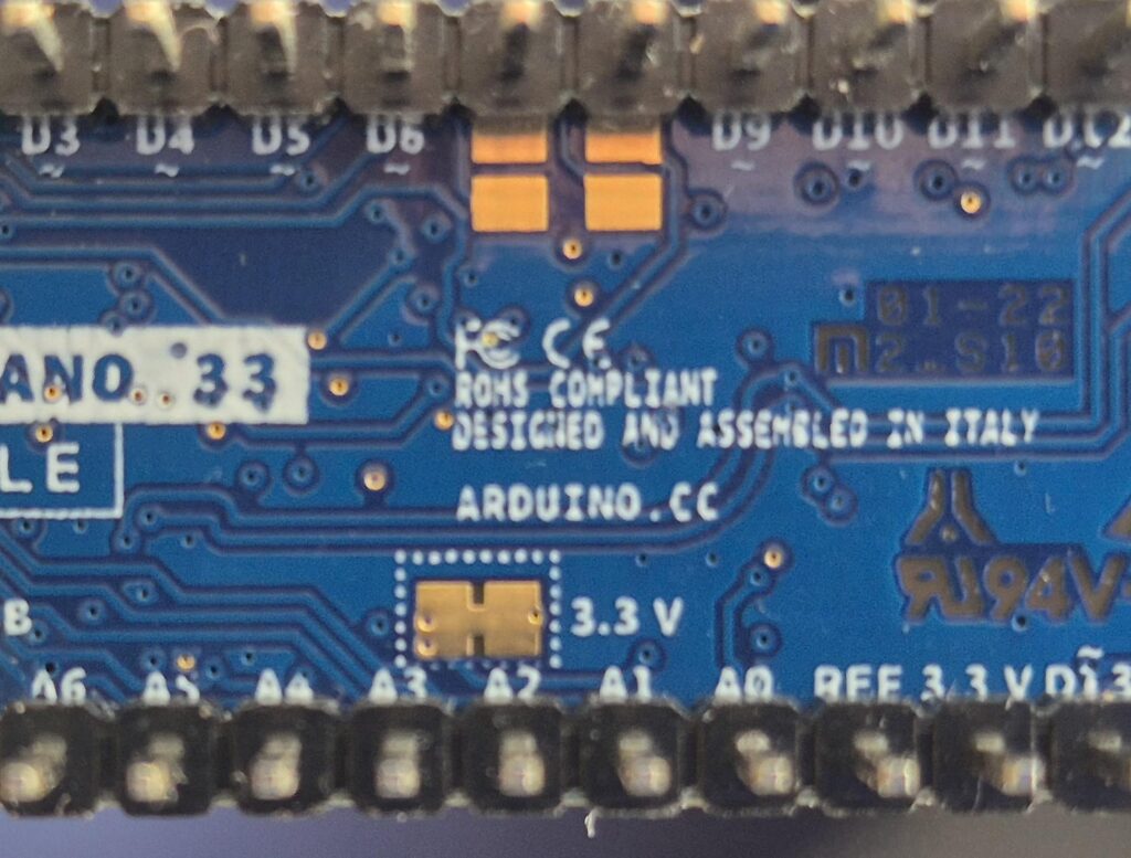 To get around this limitation, you may choose to connect the batteries to your own voltage regulator (or use a battery management module) and bypass the onboard voltage regulator on the Arduino. However, some boards don’t make provision for connection of a regulated supply at the voltage used for directly powering the components on the board. The Arduino Nano 33 BLE does allow this, but you have to cut a small track on the board and this allows the 3.3V pin (normally a power output pin) to be re-purposed as a power input pin.